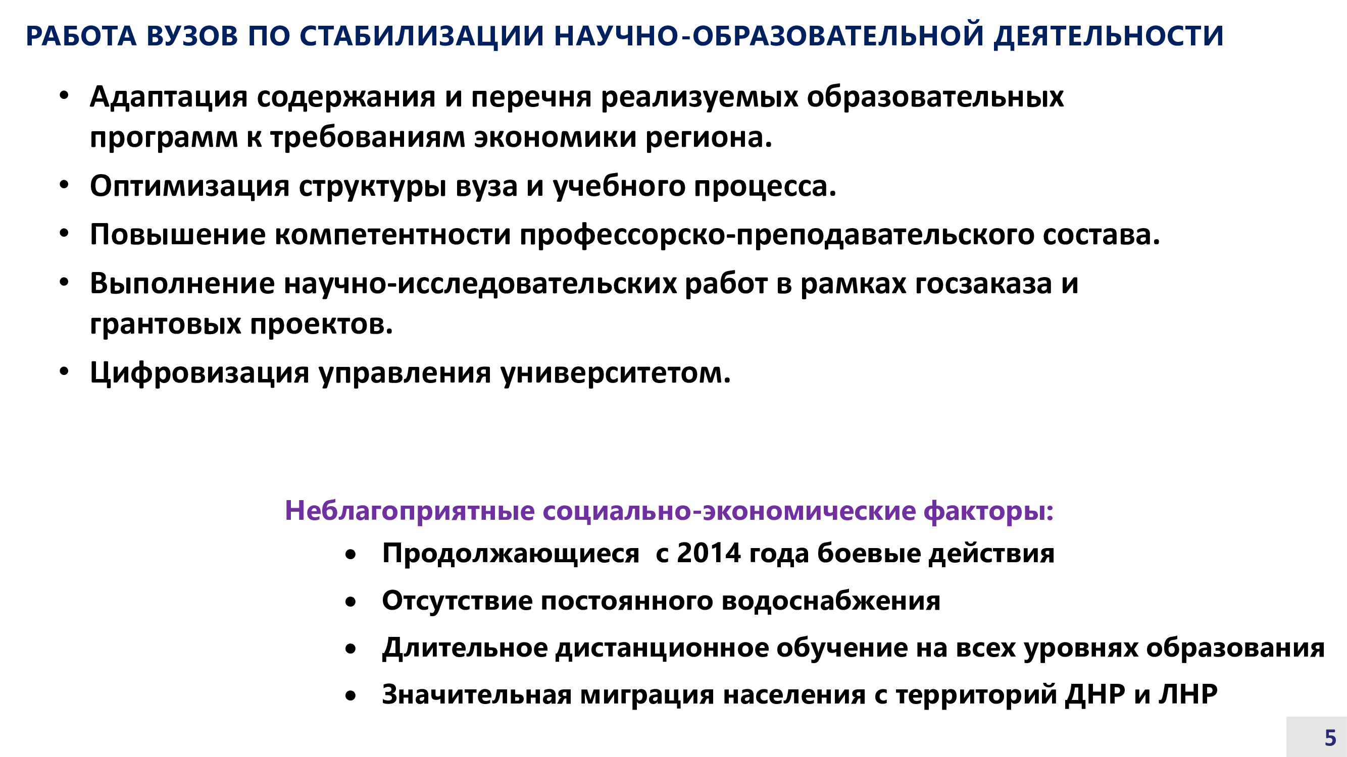 Прошедшие с того момента восемь лет явились периодом самой напряженной работы по сохранению и упрочнению позиций и наращиванию потенциала университета в научно-образовательной сфере, по реализации им функций опорного вуза Республики, по реализации миссии вуза, обеспечивающего кадровую и научно-экспертную поддержку во многих направлениях развития производительных сил и формирования социально-культурного пространства ДНР.