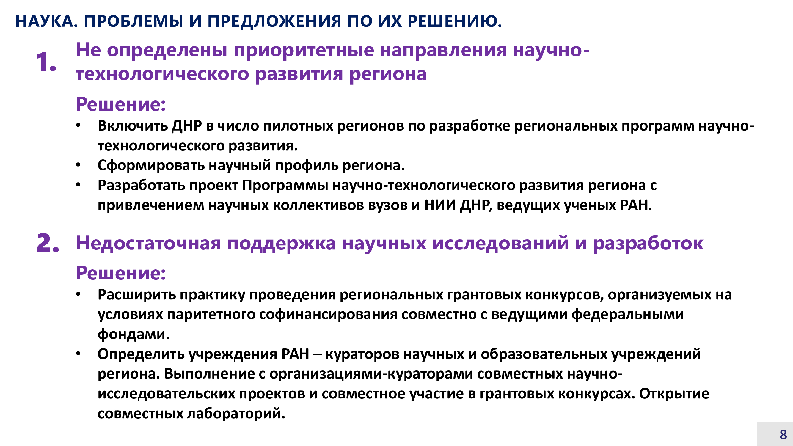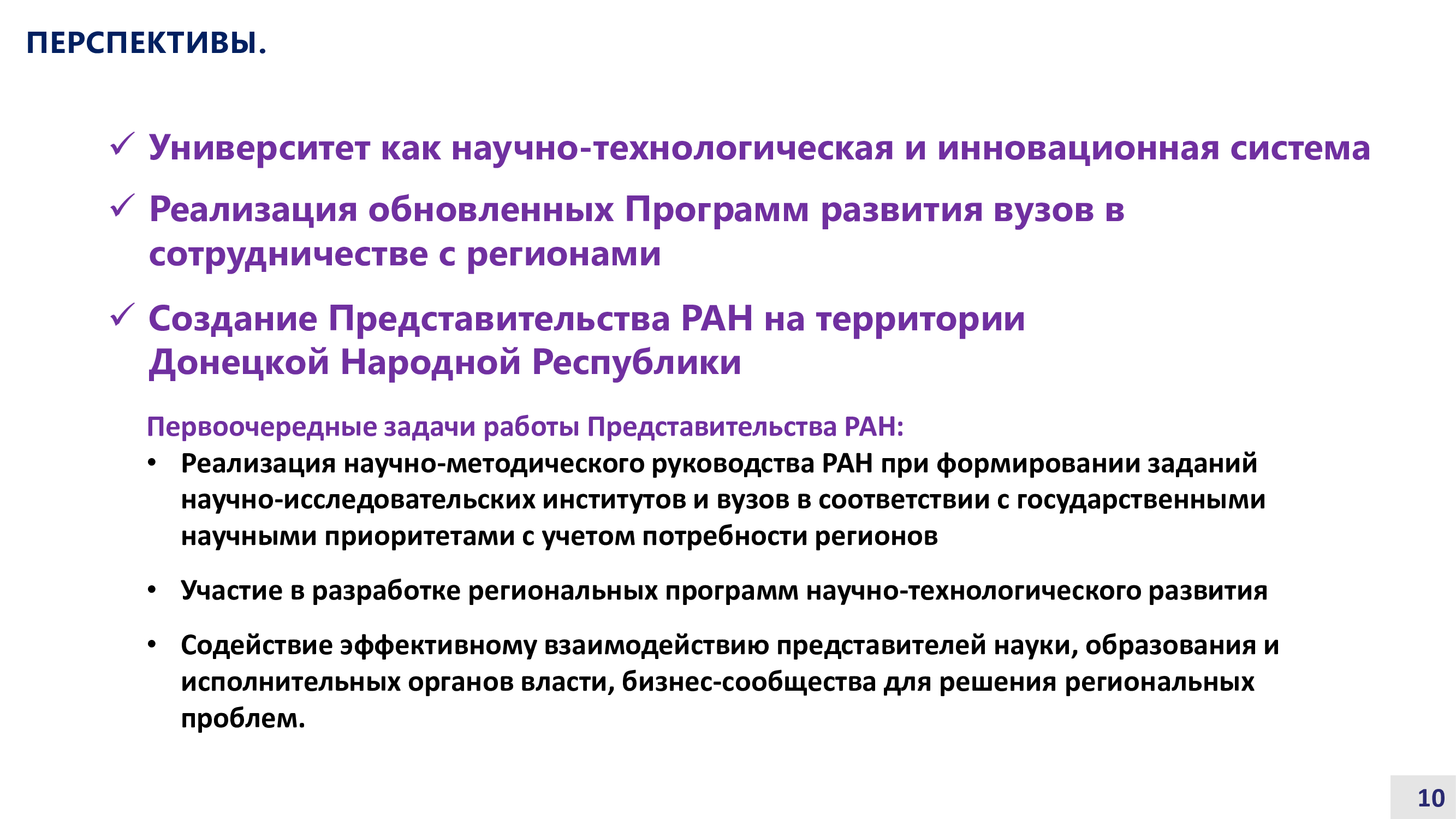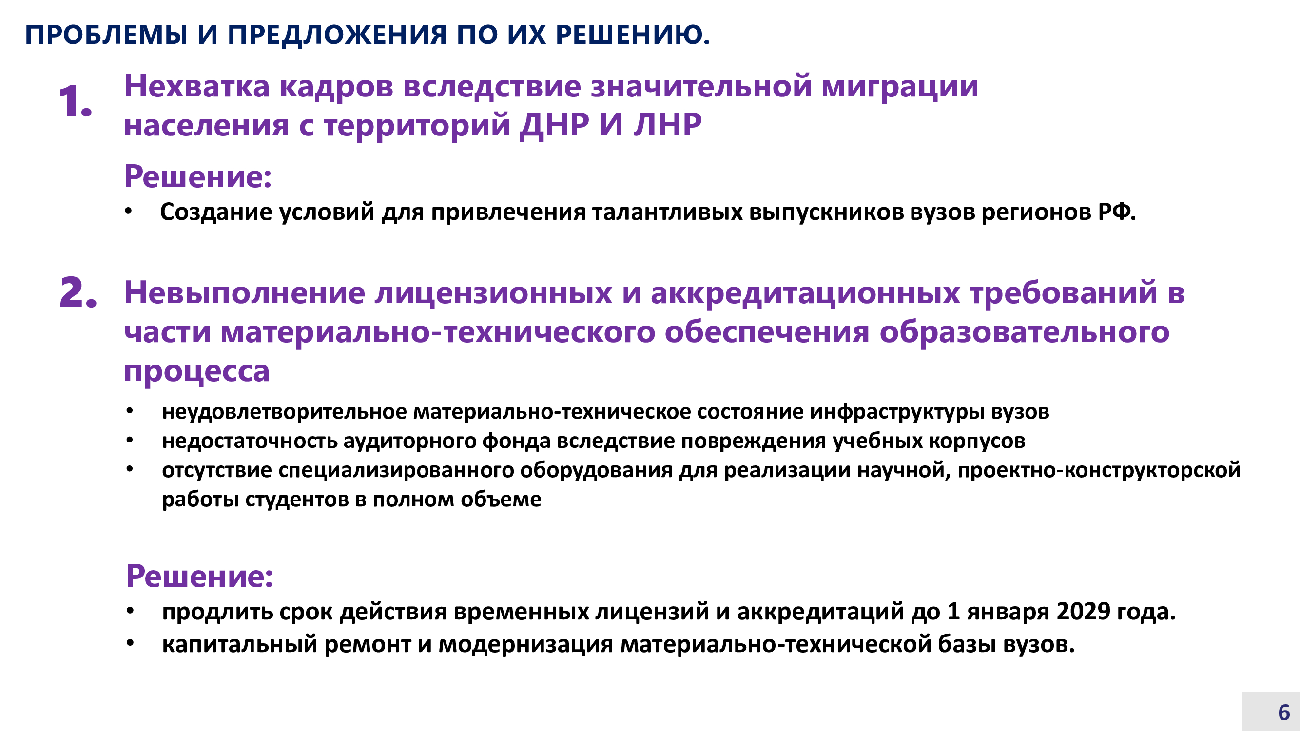 Также крайне принципиальной является для нас линия взаимодействия в вопросах подготовки кадров высшей квалификации. Сегодня только менее половины специальностей подготовки аспирантов в нашем университете, да и в других вузах и научных учреждениях ДНР, представлены в открытых в Республике диссертационных советах, что создает критические кадровые проблемы с уровнем преподавания по многим вузовским дисциплинам и обеспечением научных исследований.