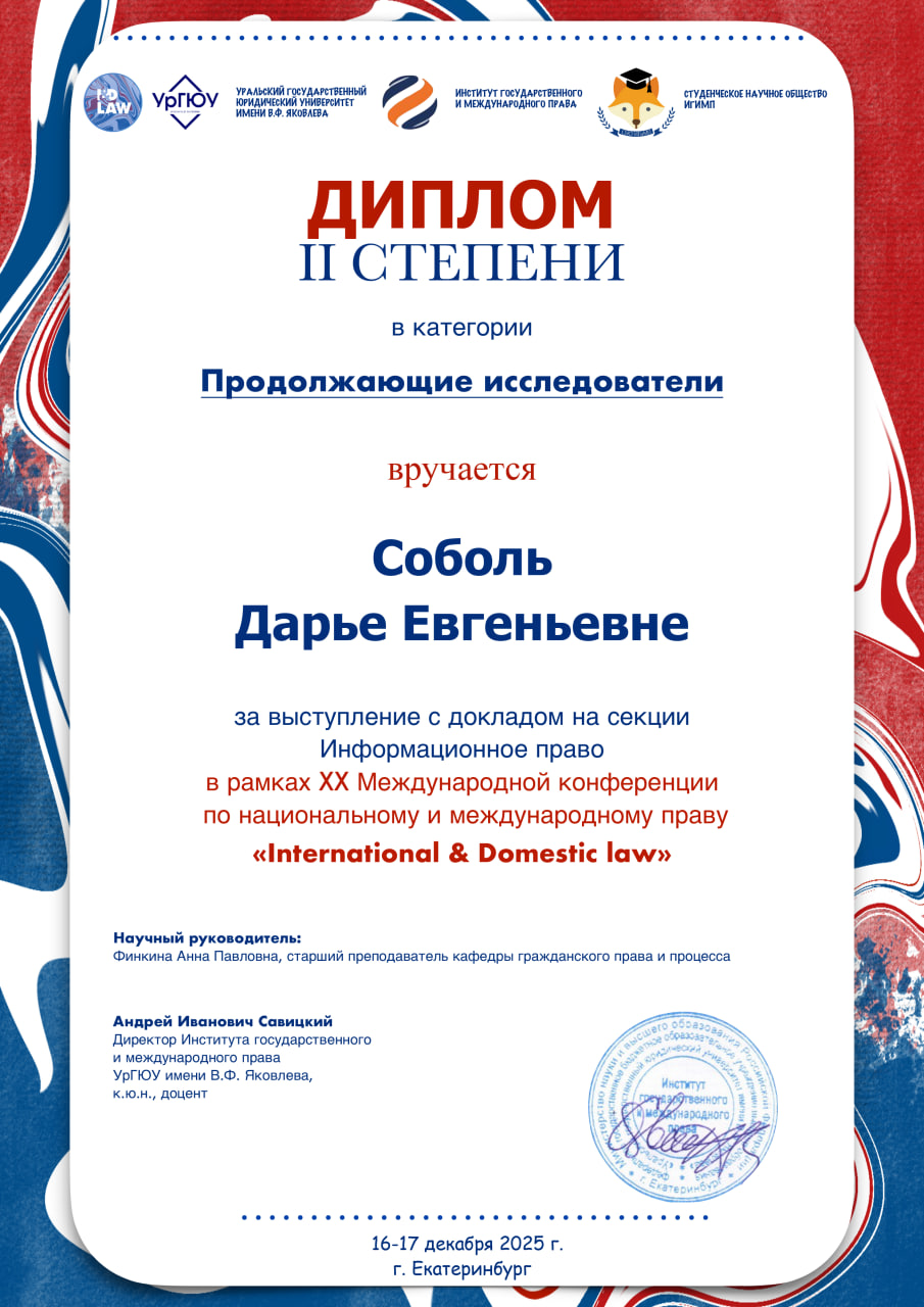 Студентка 3 курса юридического факультета Дарья Соболь успешно выступила и награждена дипломом II степени в категории «Продолжающие исследователи». Дарья продемонстрировала высокий уровень подготовки и проработки научной работы, умение продуктивно вести научную дискуссию и отвечать на вопросы экспертов. Модераторы секции высоко оценили уровень подготовки нашей студентки, рекомендовали ей не останавливаться на достигнутом и продолжать совершенствовать свои компетенции в научных изысканиях.