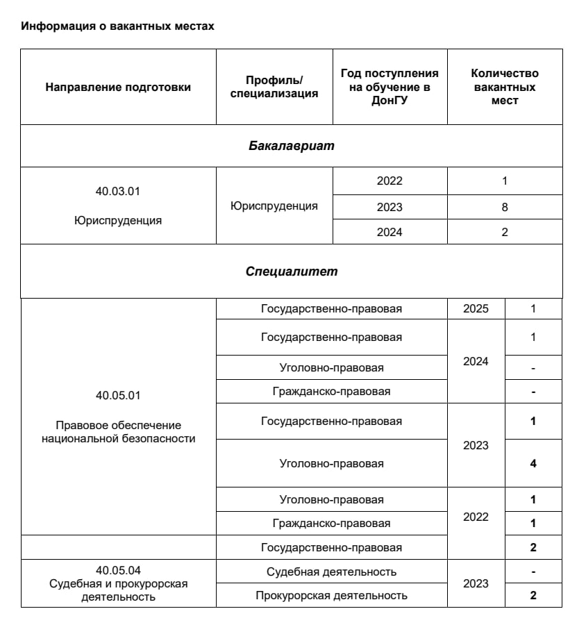 Юридический факультет ФГЮУ ВО «Донецкий государственный университет» объявляет конкурс на замещение вакантных мест обучения, финансируемых за счет бюджетных средств. Для участия в конкурсе необходимо подать в деканат факультета заявление и необходимые документы не позднее 29.09.2023 г.