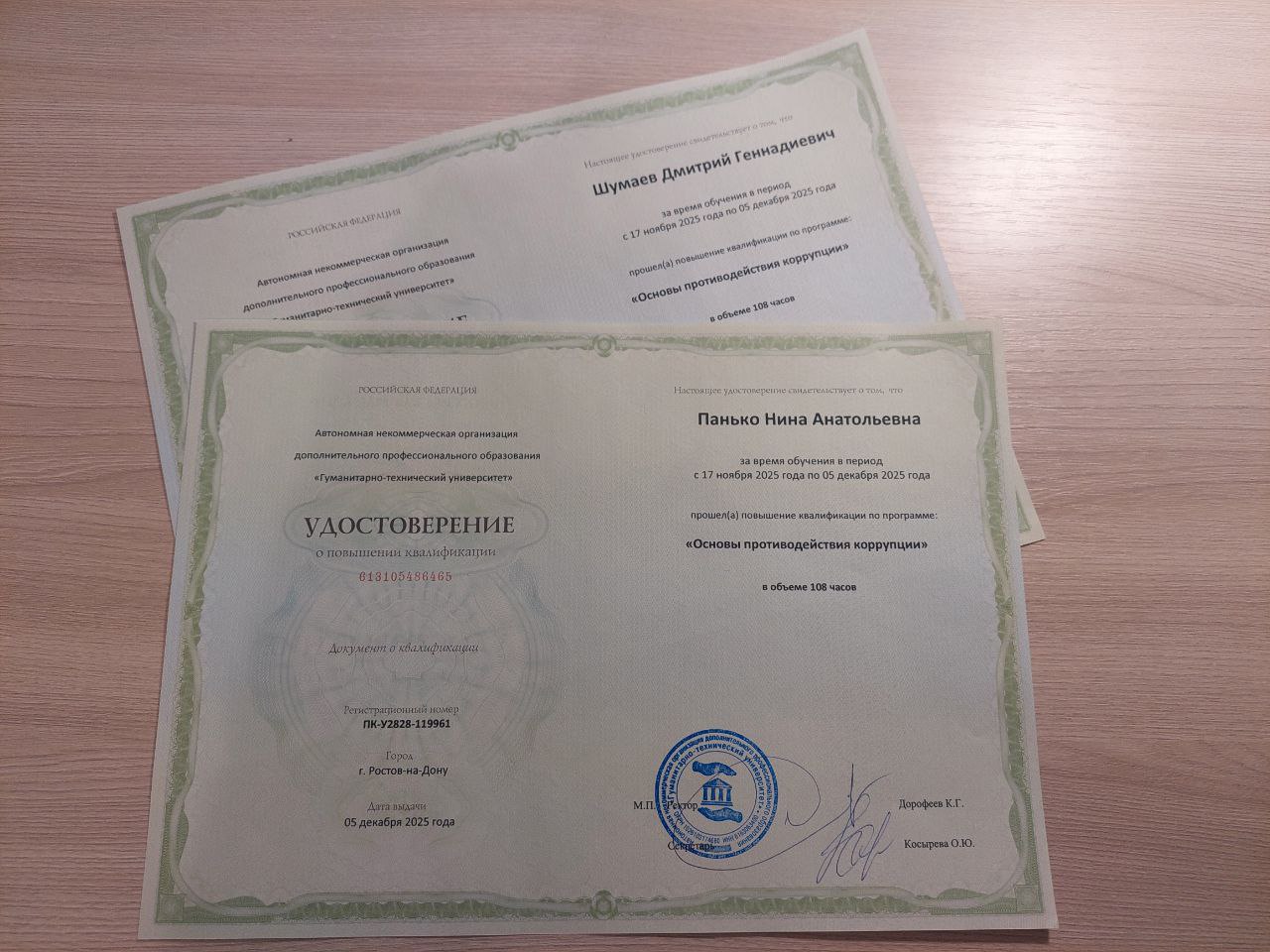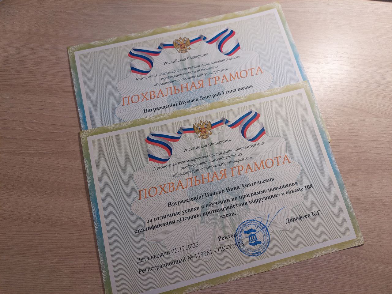 В рамках реализации Национальной стратегии противодействия коррупции и повышения уровня преподавания юридических дисциплин, доцент кафедры судебных и правоохранительных органов Дмитрий Шумаев и старший преподаватель кафедры судебных и правоохранительных органов Нина Панько успешно прошли повышение квалификации по программе «Основы противодействия коррупции» в Автономной некоммерческой организации Дополнительного профессионального образования Гуманитарного технического университета.