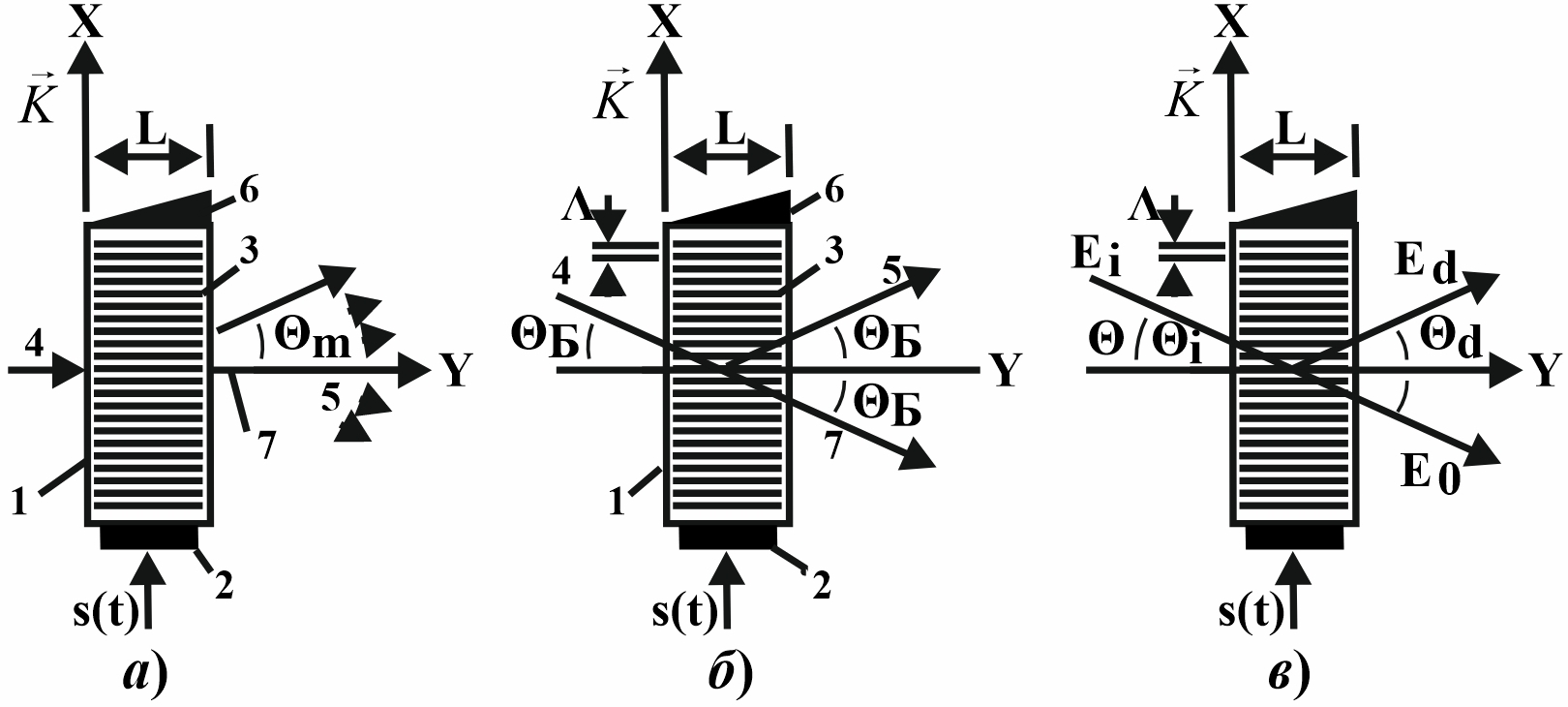Было показано, что все известные сегодня акустооптические устройства по функциональному назначению являются модуляторами лазерного пучка. Среди таковых было предложено различать: амплитудно-импульсные модуляторы (акустооптические затворы), модуляторы, осуществляющие отклонение лазерного пучка в пространстве (акустооптические дефлекторы), управляемые радиосигналами фильтры оптического излучения (акустооптические фильтры). Установлено, что основой любого акустооптического модулятора является акустооптическая ячейка (рис. 1), основными элементами которой являются светозвукопровод 4, в объеме которого происходит взаимодействие упругой (возбуждаемой электроакустическим преобразователем 2) и световой волн (акустооптическое взаимодействие). На рис. 2 изображен макет акустооптической ячейки АОЯ-1. В результате акустооптического взаимодействия (АОВ) в светозвукопроводе (СЗП) акустооптической ячейки (АОЯ) возможны следующие режимы дифракции: Рамана-Ната (рис. 3а), Брэгга (рис. 3б) и промежуточный режим (рис. 3в), отличающиеся дифракционными распределениями лазерного пучка. Критерием различимости режимов предложено считать выражение Кляйна-Кука