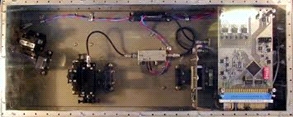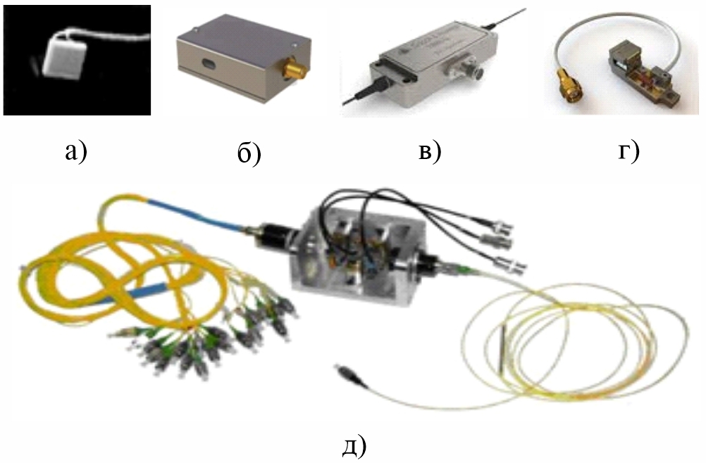 Результаты исследований и разработок акустооптических устройств совместно с Донецким НИИ комплексной автоматизации показаны ниже. На рис. 4а показан электроакустический преобразователь на основе ниобата лития. Модулятор излучения в волоконном световоде представлен на рис. 4б, мощность управляющего радиосигнала – 1 мВт, диапазон радиосигналов управления 100 – 300 МГц, длина волны лазерного излучения 1.25 мкм, глубина модуляции 20 - 63%, материал СЗП – кристалл фосфида галлия. Акустооптический дефлектор представлен на рис. 4в, материал СЗП – молибдат свинца, длина волны лазерного излучения 0,63 мкм, частота управляющих радиосигналов 300 ±80 МГц, число разрешимых точек – 256, угол отклонения от продольной оси – 0,6 рад, мощность радиосигнала управления, менее 0,3 Вт, эффективность – 60%. На рис. 4г - амплитудно-импульсный модулятор лазерного пучка (акустооптический затвор): материал СЗП – молибдат свинца, длина волны лазерного излучения 0,44 - 0,63 мкм, глубина модуляции лазерного пучка, не менее 85%, мощность радиосигнала управления – 0,5 Вт. Для волоконно-оптических линий передачи информации, разработан спектральный уплотнитель-разуплотнитель(рис 4.д), использован СЗП на основе кристалла парателлурита, быстродействие устройства 5 мкс, развязка каналов 38 дБ, количество коммутируемых каналов 20, общие потери – 4 дБ. На рис. 5 изображен акустооптический анализатор спектра.