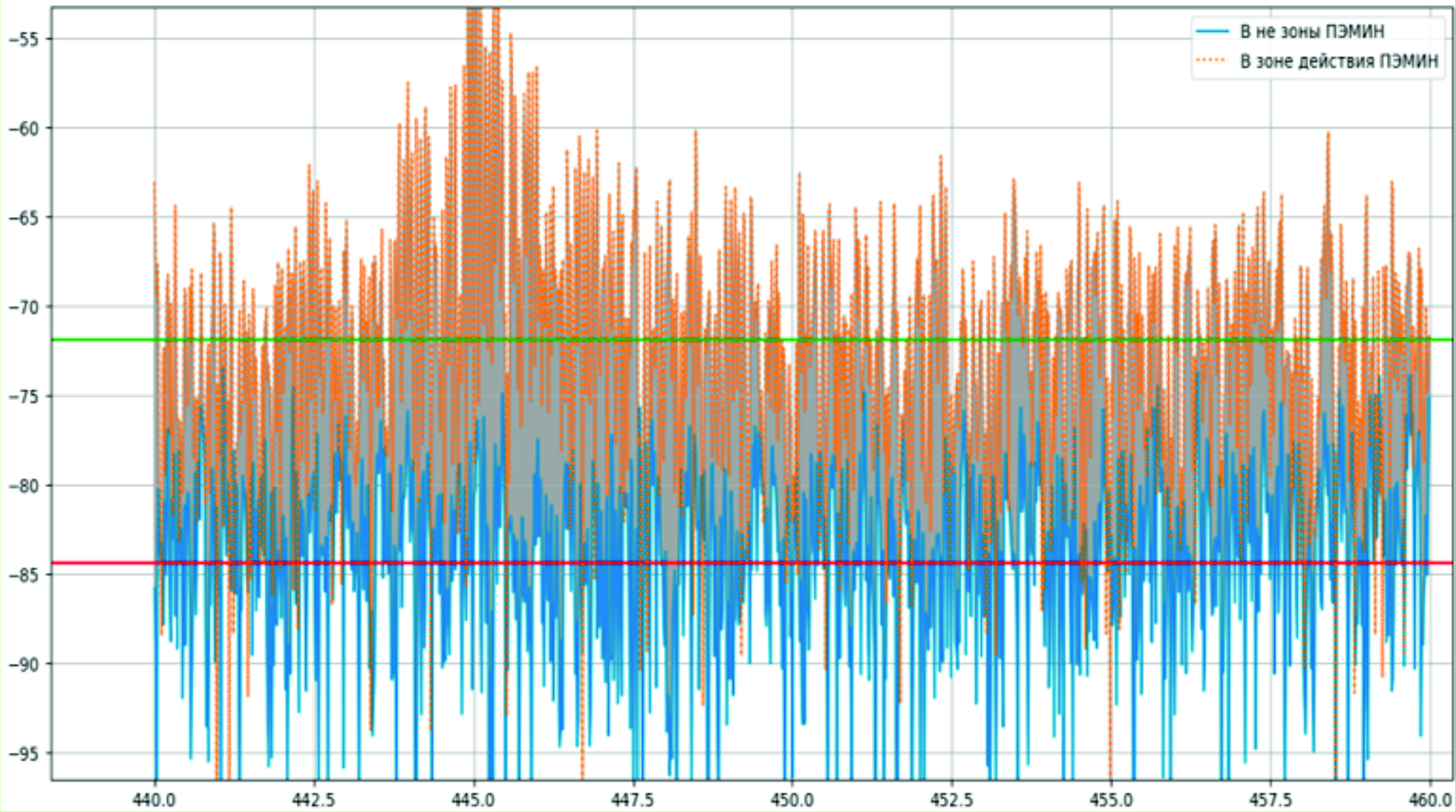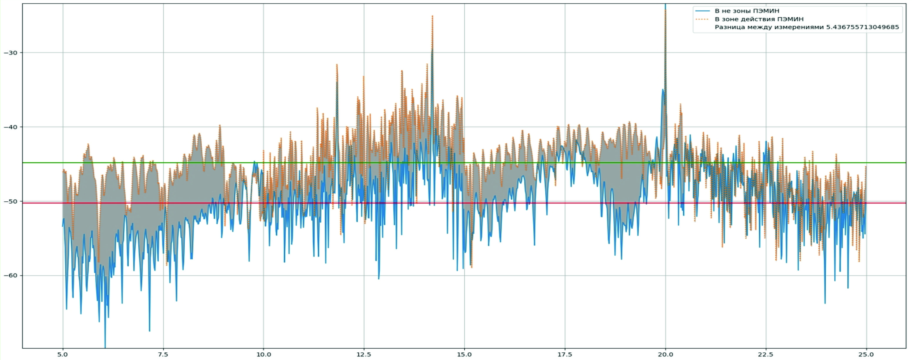 - Впервые предложена процедура автоматизированного сканирования радиообстановки, позволяющая визуально строить разностную картину между сканированием в зоне действия ПЭМИН и за пределами (рис. 1, 2).