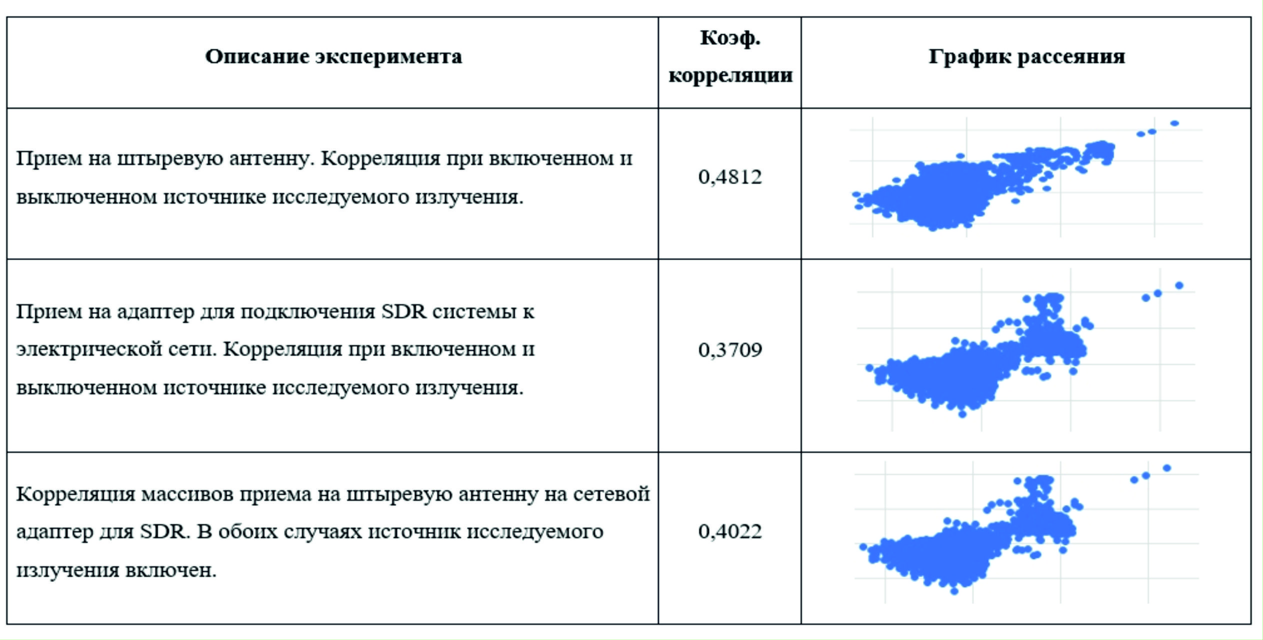 - Впервые проведен корреляционный анализ результатов измерений ПЭМИН и осуществлена оценка количественных характеристик ПЭМИН посредством спектрального анализа, что позволило выявить закономерности, указывающие на то, что слабые сигналы исследуемых побочных ЭМ излучений, транслируемые в эфир, являются потенциально менее энерговооруженной угрозой ИБ, нежели электромагнитные излучения, попадающие в электрические сети, а сигнал, промодулированный в электрическую сеть, имеет намного более широкие границы распространения, нежели аналогичные сигналы в эфире, что размывает периметр контролируемого объекта (рис. 12).