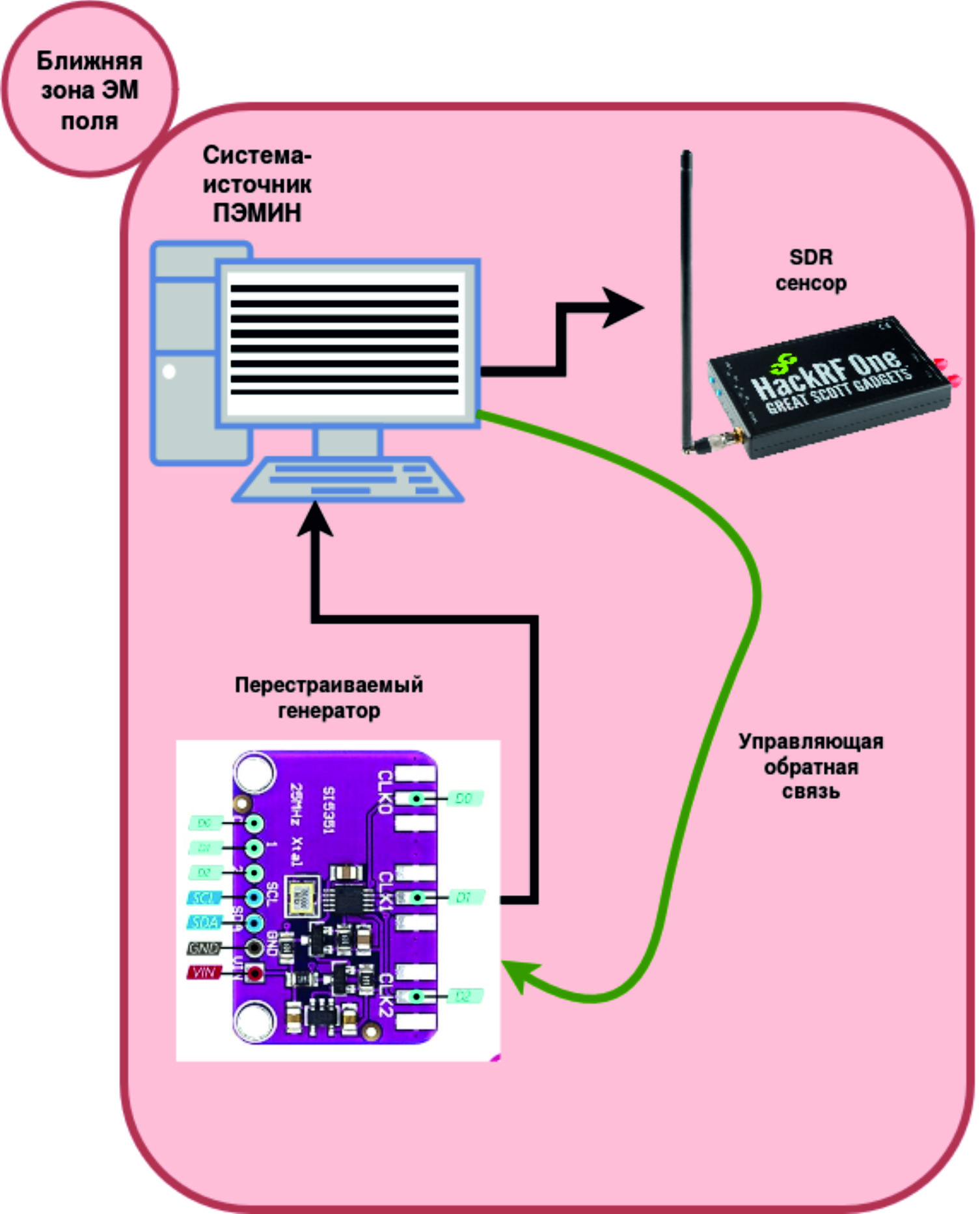- Впервые разработана и апробирована адаптивная автоматизированная система подавления побочных электромагнитных излучений и наводок вычислительной техники посредством применения высокочастотных ШИМ-сигналов, описана комплексная методика поиска и подавления обнаруженных сигналов ПЭМИН, позволяющая применять самые доступные программно-определяемые платформы для сканирования радиообстановки, что существенно снижает ее конечную стоимость (рис. 15).