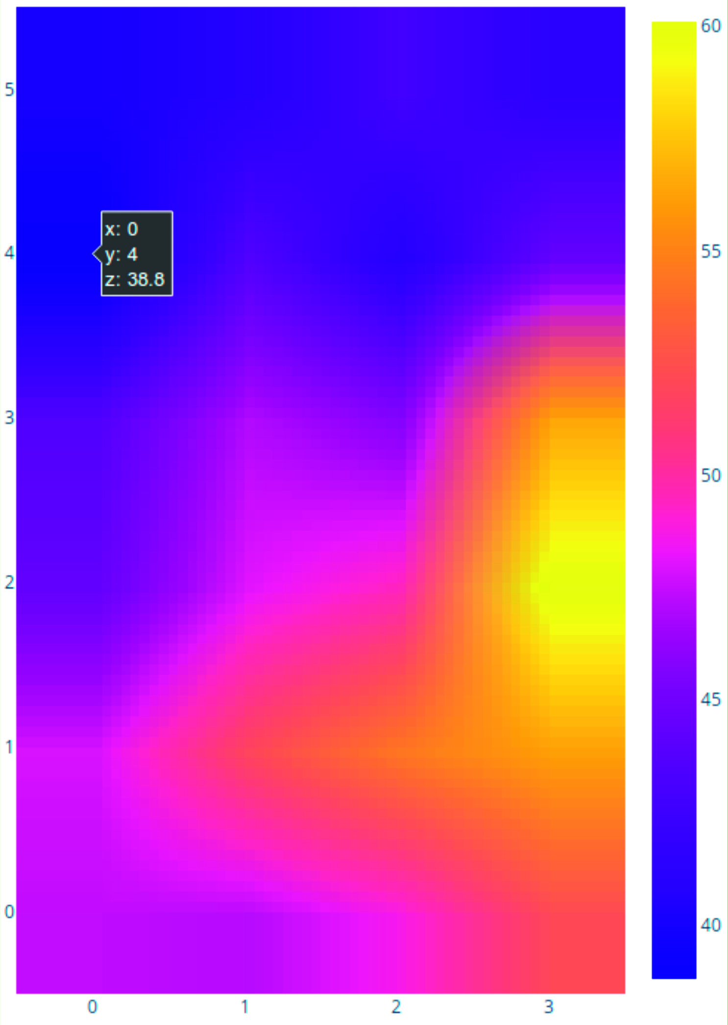 - Впервые разработаны и апробированы способ получения линейного расстояния от вещающего устройства до приемника и алгоритмы машинного обучения, позволяющие описывать закон преобразования мощности передатчика в расстояние, что позволило построить подсистему локализации оператора с радиокомплексом в границах контролируемого помещения, что в свою очередь позволяет осуществлять локализацию источника радиоизлучения и построение тепловой карты контролируемого помещения (рис. 5, 6).
