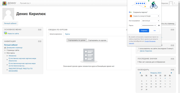 5. При входе в систему, вы попадаете в личный кабинет. В центре страницы содержится информация пользователя, последние объявления, в графе "Сводка по курсам" – список доступных электронных курсов.