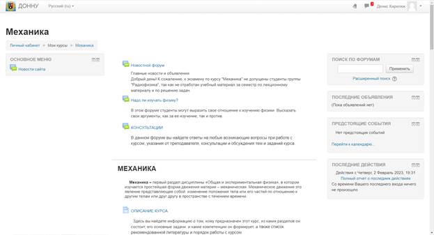Кликнув на название курса, вы автоматически попадаете в конкретную дисциплину. Материалы курса (ресурсы и интерактивные виды деятельности) на странице курса поделены на несколько разделов, которые расположены в центральной колонке.