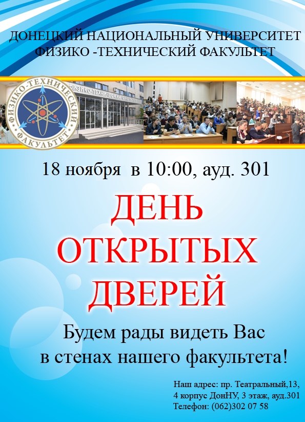 Физико-технический факультет Донецкого национального университета приглашает на День открытых дверей 18 ноября 2018 года в 10:00, ауд. №301.