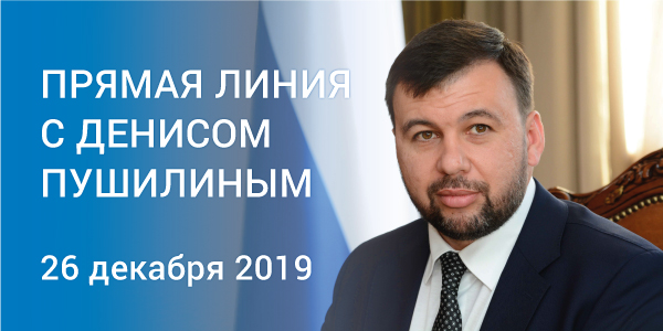 В четверг, 26 декабря 2019 года, состоится «Прямая линия с Денисом Пушилиным», которая традиционно пройдет в телевизионном формате. Глава Донецкой Народной Республики ответит на вопросы, касающиеся общественной, политической и экономической сфер жизни государства.